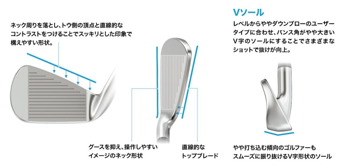 安心感のある大きめのヘッドながら、直線的なトップラインやグースを抑えたネック形状により、構えやすく、操作性のよさを感じさせます。また、V字形状のソールの採用で、レベルブローからややダウンブローの傾向のゴルファーもスムーズに振り抜けます。