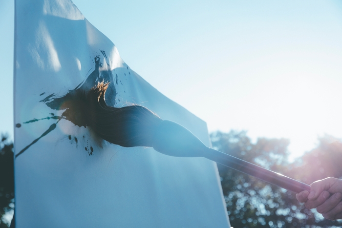 自然やアウトドアに精通したグランピングマスターの案内の下、山の中を歩き、川のせせらぎを聞きながら滝へ向かいます。辿り着いた「母の白滝」と呼ばれる滝の目前で五感を研ぎ澄まし、水の流れや音、しぶきを感じ、大書に向けて気持ちを整えるとともに集中力を高めます。