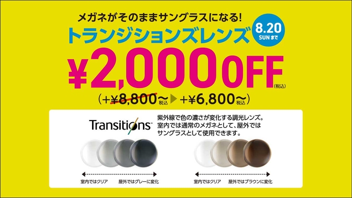 紫外線で色の濃さが変化する調光レンズ「トランジションズレンズ」が期間限定で¥2,000 OFF!