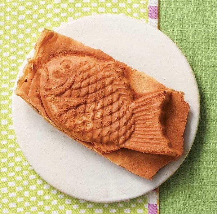 熊本県PRマスコットキャラクターのくまモンの形をした人形焼き。実演で熱々の商品を提供。