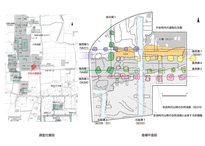 をあわせて5基新たに検出した。柱間寸法はいずれも約2.5m。石組溝1との位置関係から、東西塀1は調査区内で北折して南北塀1となる。石組溝1と同時期の遺構とみられ、両者は7世紀前半の石神遺跡東南隅を区画する施設と考えられる。