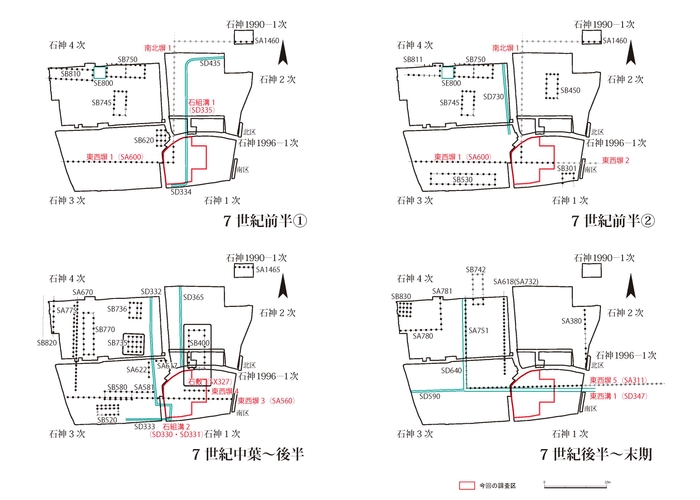 (1) 7世紀前半の遺構(皇極朝期以前、遺構変遷図①②)