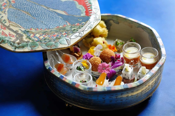 星のや沖縄のダイニングでは「琉球シチリアーナ」をコンセプトに、沖縄で親しまれる食材とシチリア料理の技法を組み合わせたコース料理を提供しています。イタリアのシチリア島の料理は、イタリア本土にはない独特な食文化が特徴で、歴史や地理的な理由から様々な国の影響を受け、今も各時代の文化を色濃く残し、そして沖縄も他の地域から影響を取り入れながら独自の料理文化を築いています。また、美しい海と温暖な気候に恵まれ、手に入れやすい新鮮な魚介や柑橘を食材に多用していることも、沖縄と類似している点です。「琉球シチリアーナ」は、類似性のあるシチリア料理の技法と沖縄で親しまれる食材を組み合わせ、沖縄の新たな食の魅力を提案しています。
