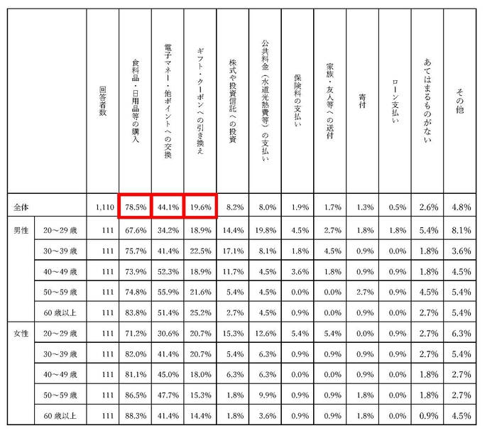・ポイントの活用方法として最も多いのは「食料品・日用品等の購入(78.5%)」と予想通りの結果。