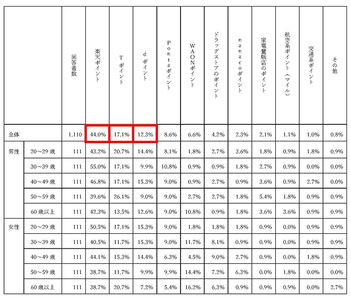 ・これに次ぐ第2位はTポイント(55.5%)で、首位の楽天ポイント同様、年齢・性別を問わず、幅広い層で利用されている結果。なお、 50代男性では楽天ポイントを上回り最多となっている。