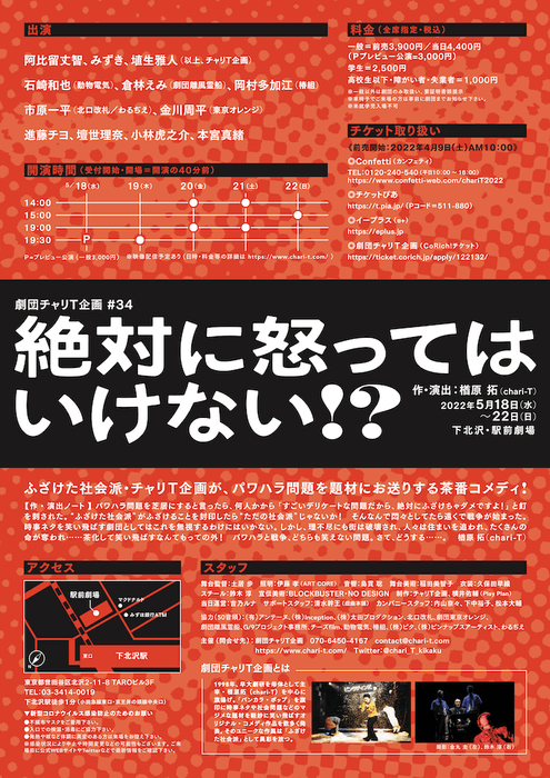 劇団チャリT企画『絶対に怒ってはいけない!?』が2022年5月18日 (水) ~2022年5月22日 (日)に駅前劇場(東京都世田谷区)にて上演されます。チケットはカンフェティ(運営:ロングランプランニング株式会社、東京都新宿区、代表取締役:榑松 大剛)にて発売中です。