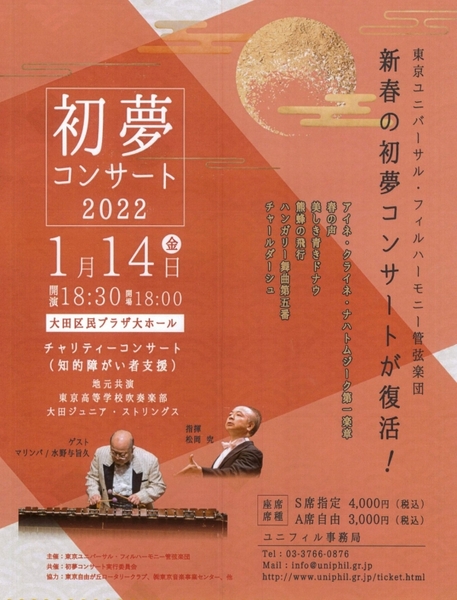 東京ユニバーサル・フィルハーモニー管弦楽団 新春の初夢コンサートが復活!『初夢コンサート2022』が2022年1月14日(金)に大田区民プラザ 大ホール(東京都大田区)にて開催されます。チケットはカンフェティ(運営:ロングランプランニング株式会社、東京都新宿区、代表取締役:榑松 ⼤剛)にて発売中です。