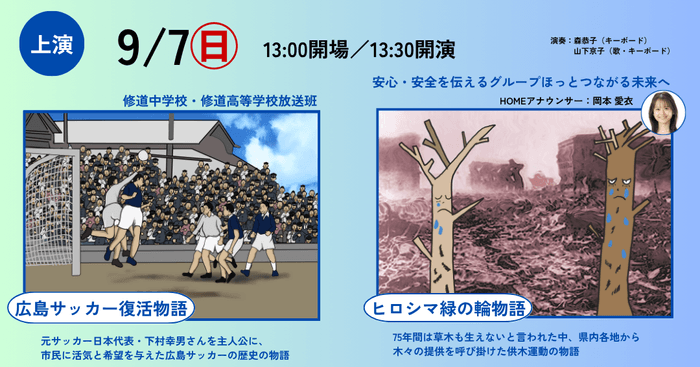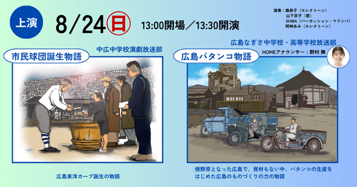 株式会社広島ホームテレビ(本社:広島市中区 代表取締役社長:佐藤以誠)は、被爆80年企画および開局55周年記念事業として、一般社団法人まち物語制作委員会(所在:広島市西区 代表理事:福本英伸)、広島市と共に、8月24日(日)、9月7日(日)、10月12日(日)の3日間、広島平和記念資料館東館地下1階 メモリアルホールで、絵おと芝居2025「ヒロシマを復興させた力」を上演します。