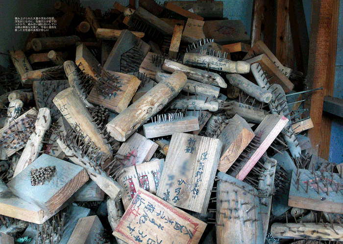 錆びたハサミ[縁結び]、釘を打った男根[浮気防止]、女性の髪の毛[病気平癒]、花嫁人形[幼年で亡くなった息子へ]、御神木に打ち付けた鎌[子宝祈願]、朱塗りの猿[安産祈願]、ハシゴ[おねしょ封じ]、紙で作ったスマホ[燃やしてあの世へ]……