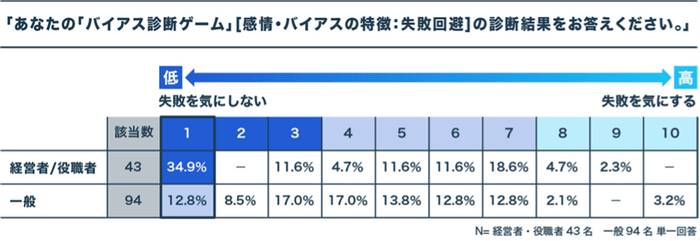 失敗に関する感度であるバイアス❝失敗回避❞において数値が低いと、失敗を気にしない性質があります。企業において責任のある立場の経営者・役職者層に絞って特徴を見てみると、10段階の中で最も低い1の回答が34.9%となり、「失敗を気にしない」人に偏ることが判明。