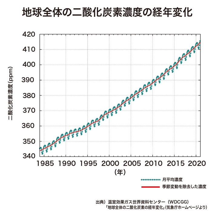 参照:地球全体のCO₂の経年変化/気象庁 (2022年10月27日)https://www.data.jma.go.jp/ghg/kanshi/ghgp/co2_trend.html