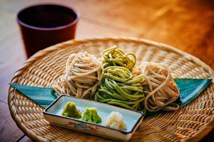 その他、口の中でとろけるほど身がフワフワな穴子や大振りの海老、季節に合わせた旬野菜の”天麩羅“、その時期に旬の魚介類を使用した”季節の真薯のお吸い物“など様々な椀物を提供いたします。蕎麦は、伝統的な二八蕎麦に、海藻の中でも特に栄養価が高い“アカモク”や、豊富なミネラルと食物繊維を含む“長命草”など、鮮やかな色合いや風味を堪能できる“変わり蕎麦”を組み合わせ、これまでにない革新的なモダン蕎麦割烹をコースで提供いたします。