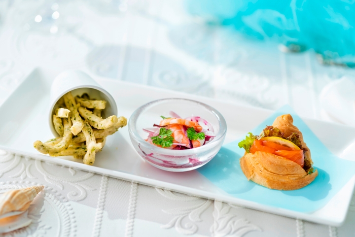 海苔塩ポテトフライ・紫キャベツとシュリンプのセビーチェ風サラダ・クロワッサンのスモークサーモンサンド