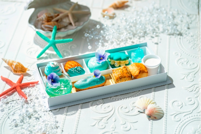メレンゲの珊瑚がのったグレープフルーツ味のオーシャンゼリー、真珠貝をかたどったレモン風味のマカロン、ココナッツのムース、巻貝に見立てたガレットなど、珊瑚や貝殻などのモチーフとオーシャンブルー×ホワイトカラーの涼しげなスイーツに加え、クロワッサンのスモークサーモンサンド、海苔塩ポテトフライなど海の幸を使用したセイボリー、2種のスコーンとともに、紅茶やハーブティーも飲み放題でご提供いたします。