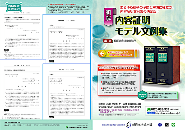 新日本法規出版株式会社(所在地:愛知県名古屋市中区、代表取締役社長:河合誠一郎)は、「明解 内容証明モデル文例集」(編集:石原総合法律事務所)を増刷し、2024年11月8日(金)に入荷いたしました。