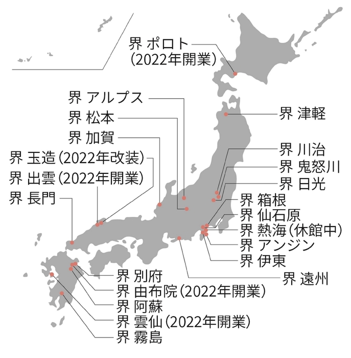 「界」は星野リゾートが全国に展開する温泉旅館ブランドです。「王道なのに、あたらしい。」をテーマに、季節の移ろいや和の趣、伝統を生かしながら現代のニーズに合わせたおもてなしを追求しています。また、その地域の伝統文化や工芸を体験する「ご当地楽」や、地域の文化に触れる客室「ご当地部屋」が特徴です。2022年11月に、21施設目となる「界 出雲」が島根県・出雲ひのみさき温泉、22施設目となる「界 雲仙」が長崎県・雲仙温泉に新規開業しました。