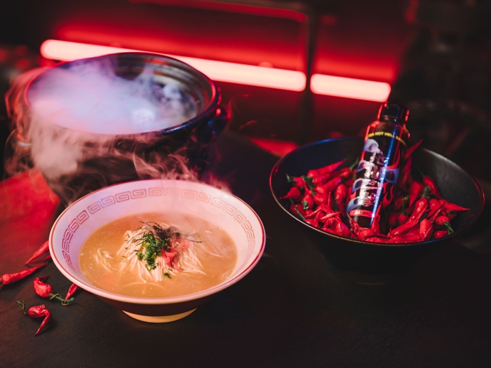 別府温泉の多くは源泉が50度近くもあり、ジモ泉と呼ばれる共同浴場も「あつ湯」が多いことで有名です。そんな別府温泉の特性にちなみ、身体が芯から熱くなる屋台グルメを提供します。「地獄ラーメン」は「地獄の一撃」と呼ばれる唐辛子スパイスをかけて好みの辛さに調整できます。生姜の風味が特徴の大分銘菓「臼杵せんべい」は、追加の生姜ソースや生姜パウダーを用意しています。