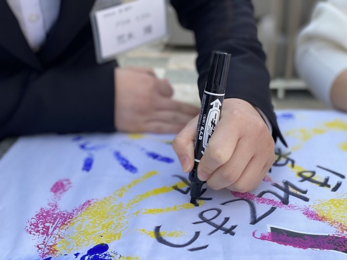 2007年の入社式より恒例となっている「契りの会」では、これから働く決意をこめて新入社員がチーム毎に川柳を読み上げ、手のひらを絵具に浸し、手形を押す手形の契りを交わしました。手形の契りは、社員と会社の間で結ぶ2つの約束を意味しています。1つ目は、当社が社員に対し、法律上の雇用関係だけではなく、時には雇用主と雇用者との関係を超えて社員を助ける、という約束です。2つ目は、社員が研修で学ぶ組織文化に寄与するという約束を意味します。今回の「契りの会」には、代表の星野佳路や、2月7日以降に着任予定である施設の支配人もオンラインで温かく見守りながら進めました。