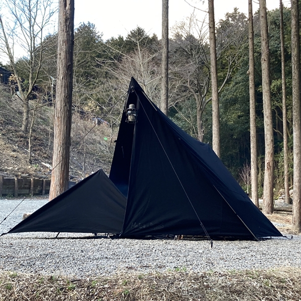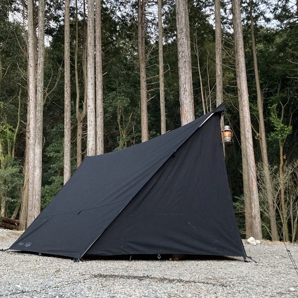 厚手のT/C素材と直線的なフレームから構成されるシルエットは唯一無二のデザイン。焚火の火の粉にも強く、撥水加工で全天候型のテントに仕上がっています。