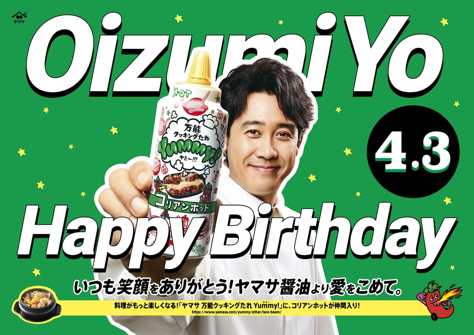 2月20日(木)より全国で新発売となった「ヤマサ 万能クッキングたれ Yummy! コリアンホット」の商品開発をする過程で、韓国の食やエンターテインメントカルチャーに触れていく中で、アイドルなどの誕生日にファンが広告を出す『応援広告』という愛の表現を知りました。2015年からヤマサ醤油のCMに出演してくださっている大泉洋さん。約10年もの間、ヤマサ醤油に寄り添っていただいているパートナーとして、日頃の感謝を込めてお誕生日をお祝いしたいと思い、『応援広告』という形式で広告を制作いたしました。ファンの皆様と一緒に、大泉さんのお誕生日をお祝いできましたら幸いです。