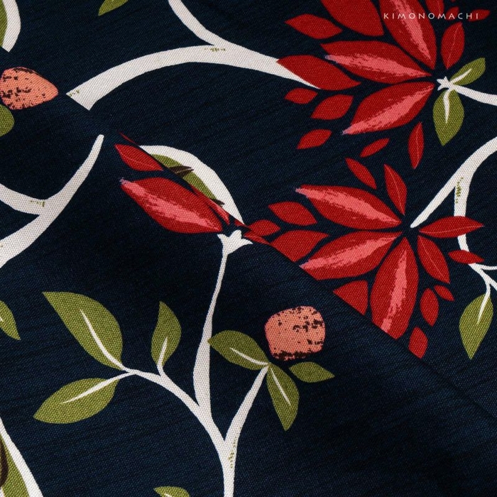 細かに黒を織り交ぜた濃く深いネイビー地に、艶やかな赤紅色×ピンクの花、白い枝のモダンなフラワー模様。