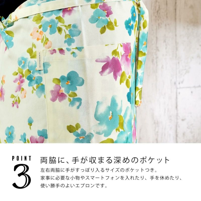 左右両脇に手がすっぽり入るサイズのポケットつき。家事に必要な小物やスマートフォンを入れたり、手を休めたり、使い勝手のよいエプロンです。