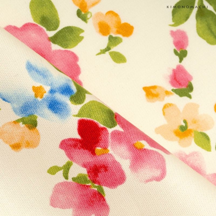 柔らかな白色地に、ピンク、ブルーなどの色使いの水彩画のようなお花模様。かわいらしく優しい印象です。