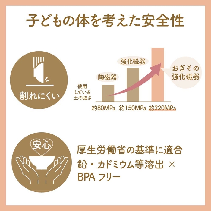 強化磁器は、保育園・学校の大量調理で30年以上愛用されている割れにくい材質が特徴で、ご家庭用の陶磁器と比べて強度が約3倍、強化磁器業界の中でもトップクラスの強度を誇ります。