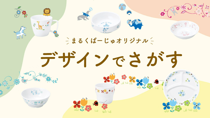 まるくぱーじゅでは、四つ葉の小鉢など形が楽しい食器から、淡くやさしいパステルカラーがかわいいNOAシリーズ、どうぶつの絵柄がかわいいさふぁりシリーズなど思わず食事の時間が待ち遠しくなる子ども食器を多く取り揃えております。