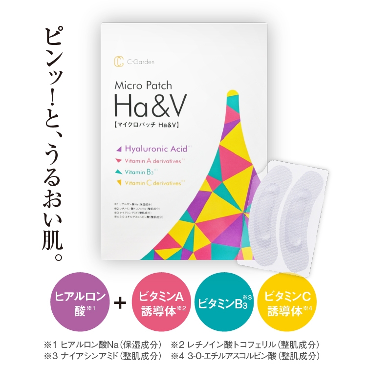 そして当社は、そのヒアルロン酸に3種類のビタミン(※3)を配合したマイクロニードルを開発し、その4つの成分を角質層までダイレクトに届ける「シーガーデン マイクロパッチ Ha&V」の販売を2021年秋に開始しました。