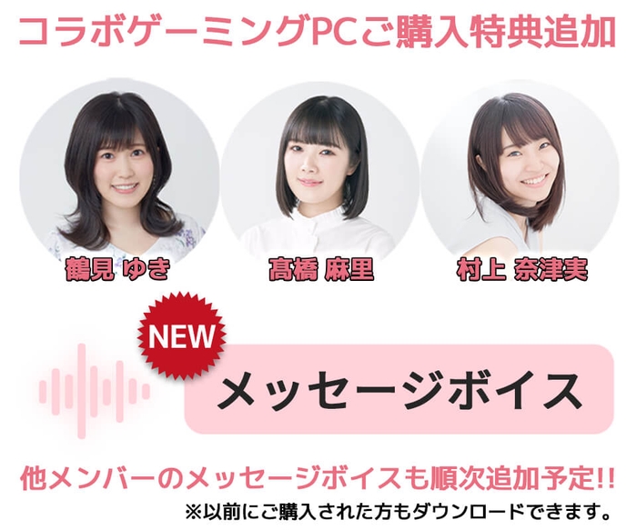 声優e-Sports部LEVEL∞コラボゲーミングPCご購入特典に「鶴見ゆき」「髙橋麻里」「村上奈津実」のメッセージボイスを追加いたしました。
