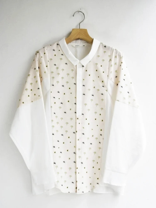 シアー感のある軽やかナチュラルで柔らかいシャツ生地と“… and a flower” の切り替えデザインシャツブラウス。しわになりにくく、ジャケットや、ニットカーディガンのインナーとして活躍します。