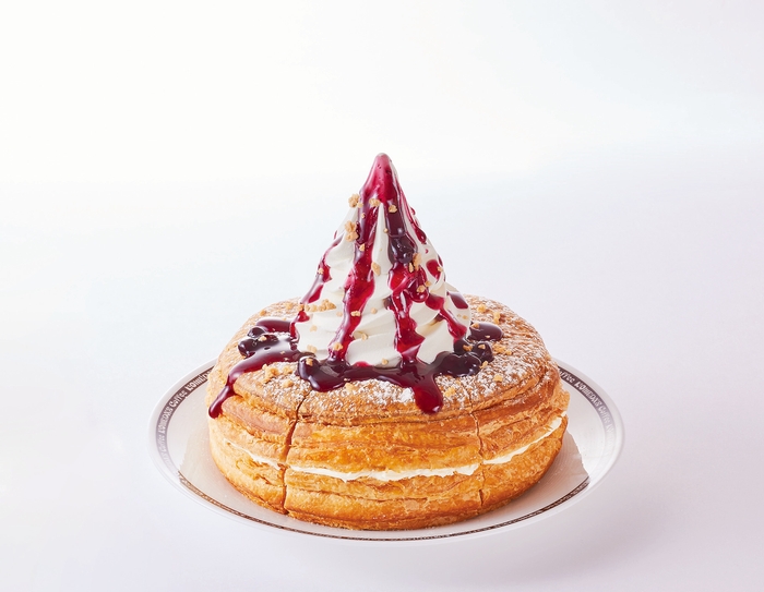 フロマージュは、フランス語でチーズのこと。クリーミーな味わいとなめらかなくちどけが特徴のクリームチーズを、ほかほかのデニッシュパンにたっぷりとサンドしました。ソフトクリームの上からは、果肉感たっぷりの色鮮やかなブルーベリーソースをとろりとかけ、ザクザククランチをトッピング。春らしいキュートなシロノワールに仕上げました。