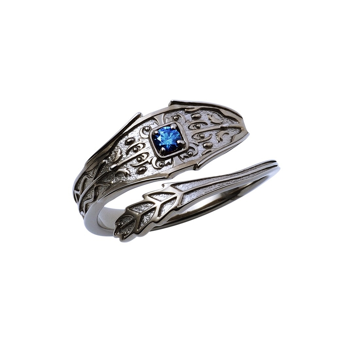 島田の指環(刃)は上品なブラックコーティングを施したナイフエッジの型に、オーバルカットのイメージカラーストーンを配しました。存在感がひき立つデザインです。