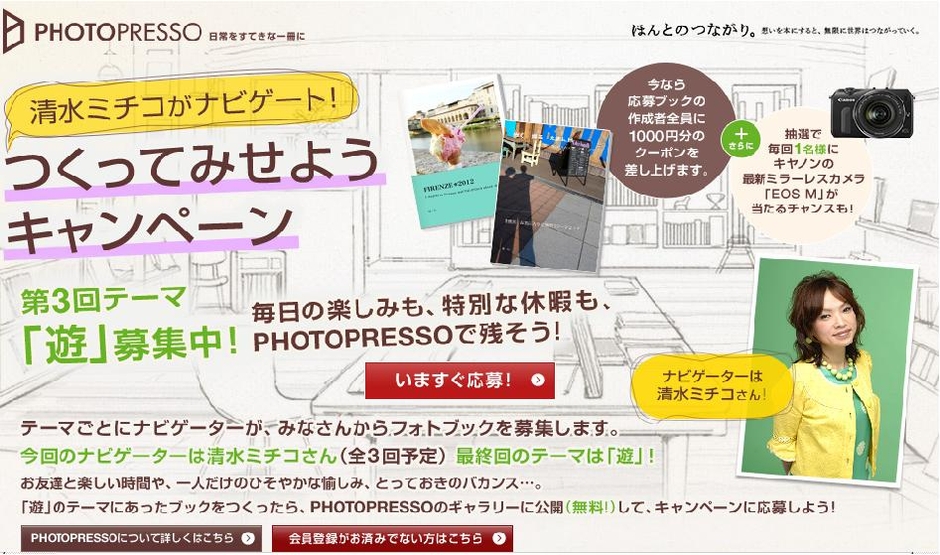 ついに最終回!大好評開催中、最新ミラーレスカメラが当たる!PHOTOPRESSO「つくってみせようキャンペーン」。第3回ナビゲーターは清水ミチコさん