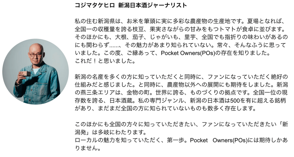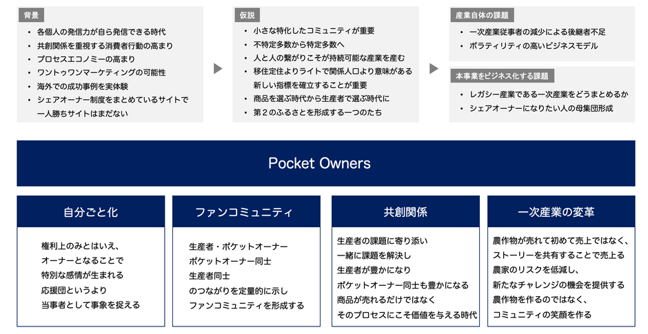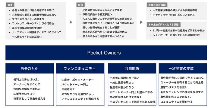 Pocket Ownersでは、生産者や同じ志を持つ仲間と繋がった「オーナー」同士が、ファンコミュニティを作り共創関係を築くことで、「その地域の一員として」生産者を継続的に支援。さらに、所属する小さなコミュニティ同士を繋げてゆき、一次産業や二次産業への新しい関わり方により、地方の活性化も進める計画です。