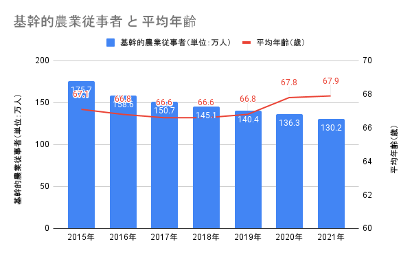 農林水産省の発表では、2015年には175.7万人であった就労人数が、2021年には130.2万人へ減少していることが報告されています。また平均年齢も、2015年の67.1歳から2021年には67.9歳へと増加しており、高齢化が進んでいます。