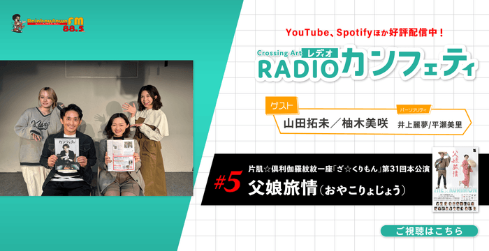 第5回目のゲストは片肌☆倶利伽羅紋紋一座 座長の山田拓未さん・山田拓未さんと共に夫婦役を務めた柚木美咲さん。2024年10月にシアターグリーン BOX in BOX THEATERにて上演した片肌☆倶利伽羅紋紋一座「ざ☆くりもん」第31回本公演「父娘旅情」について語っていただきました。