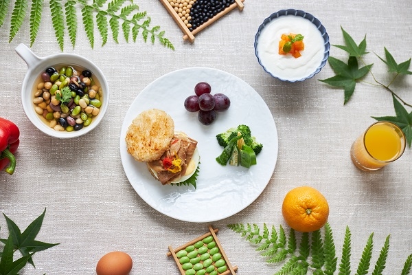 本プログラムでは、体重50kgの成人女性が1日に必要とされているタンパク質量40g*9を摂取することができる、植物性と動物性のタンパク質を豊富に含む、豚肉のごはんバーガーや豆のスープの朝食を提供します。朝食後は、緑に囲まれたウォーターガーデンで深呼吸をしながら、身体をしっかり動かし体幹の筋肉を鍛える運動プログラム「木陽森呼吸(もくようしんこきゅう)」の時間です。滞在中に得た筋肉量を増やすための知識や運動を、日常にも取り入れて習慣化することを目指します。