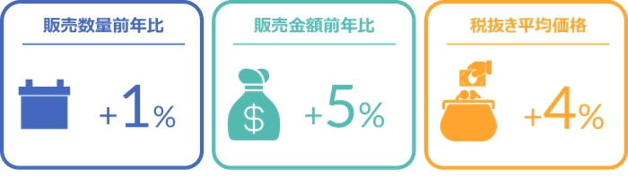 2024年4月の自動車用バッテリー販売は数量前年比1%増と微増で、店頭では2%減であったことに対し、インターネットでは6%増となった。規格別にみると、B20が数量前年比10%増、D26が同16%増と著しく伸長した一方で、B19は同2%減、B24は同7%減と前年を下回った。バッテリー全体の平均価格は前年同月から4%上昇し13,519円となり、店頭では6%、インターネットでは1%上昇した。金額前年比は5%増の微増で推移し、店頭では4%増、インターネットでは7%増であった。