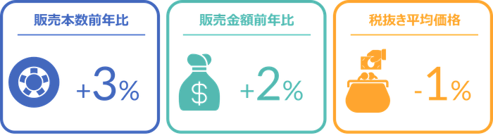 2024年4月の自動車用タイヤ販売は本数前年比3%増と微増で、店頭では同2%増、インターネットでは同5%増であった。夏タイヤは本数前年比7%増に転じ、4月に入って夏タイヤへの履き替えが一気に進んだことがうかがえる。タイヤ全体の税抜き平均価格は10,455円と前年同月から1%下落した。店頭では2%上昇したことに対し、インターネットでは6%下落した。この結果、タイヤ全体の金額前年比は2%増で推移した。店頭では4%増の伸長であった一方、インターネットでは1%減と前年をわずかに下回った。