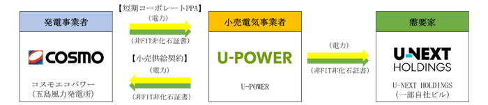 株式会社U-NEXT HOLDINGS(本社:東京都品川区、代表取締役社長CEO:宇野 康秀、以下、U-NEXT HOLDINGS)のグループ会社である株式会社U-POWER(東京都品川区、代表取締役社長:高橋 信太郎、以下、U-POWER)と、コスモエネルギーホールディングス株式会社(本社:東京都港区、代表取締役社長:山田 茂)のグループ会社であるコスモエコパワー株式会社(本社:東京都品川区、代表取締役社長:野地 雅禎、以下、コスモエコパワー)は、再生可能エネルギー由来の電力調達・供給(実質的な供給を含む)についての取り組みを開始したことをお知らせします。