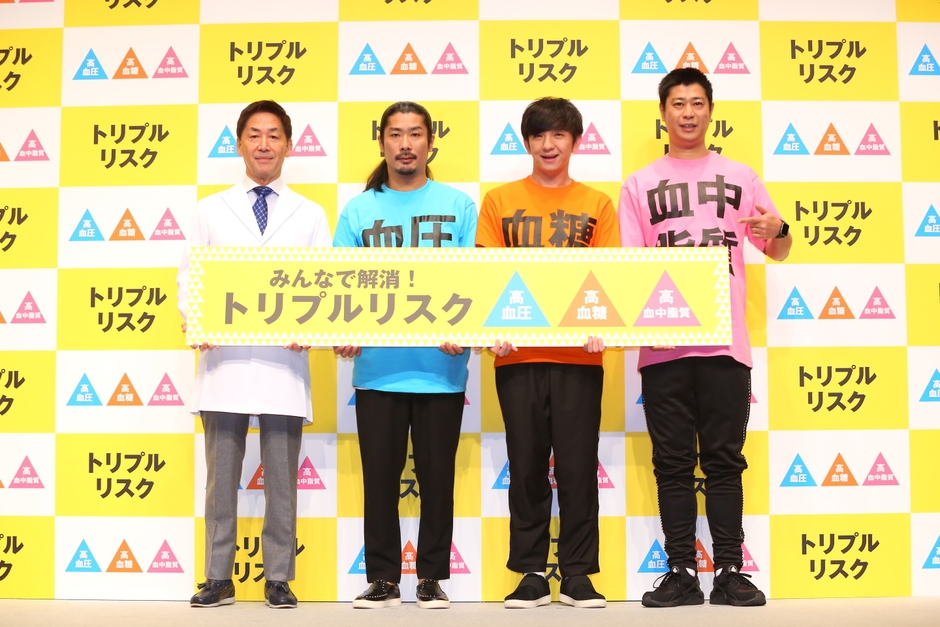 最後にゲストとして、お笑いトリオのパンサーが「血圧」「血糖」「血中脂質」と書かれたTシャツを着て登場。3つのリスク要因が連鎖するという「トリプルリスク」をイメージさせるような、3人の手足が棒で繋がった状態になっているため、1人が転ぶと3人とも転んでしまうなど、うまく動くことができません。