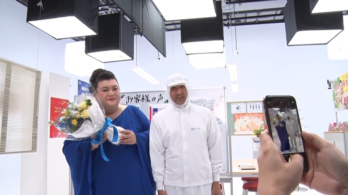 撮影現場では、一足先に「超わさび」「超梅しそ」を試食したマツコデラックスさん。「超わさび 辛さレベル2」を食べると、おいしさに思わず「ビール飲んでいい?めっちゃおいしい!」と大喜び。撮影では「超梅しそ 酸味レベル2」で酸っぱい顔をしたり、「超わさび 辛さレベル2」に悶絶したりと、様々な表情を見せてくれました。亀田製菓社員には、「上手くやらなくていい、そのままでいいんですよ」と演技指導(?)をする場面も。撮影の最後に亀田製菓社員から花束を渡されると、「サイトウ(亀田製菓社員)、ほら、2人で写真を撮ろう」と声をかけ、記念撮影をしていました。