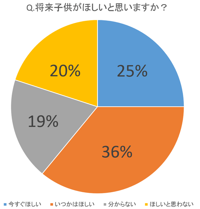 未婚既婚を含む働く女性700人に「将来、子供がほしいと思いますか?」と尋ねたところ、約6割が「ほしい」と答えています。また、「あなたの職場は妊娠・出産について協力体制ができていると思いますか?」という質問や、「出産後、仕事はどのようにしたいですか?」という質問に対しても、6割が「整っている」「産後も働く」と答えており、女性が働きながら出産・子育てをしていくという意識が高まり、そのための環境整備が進んでいると言えそうです。