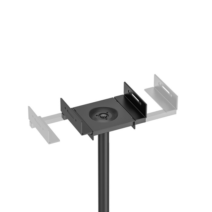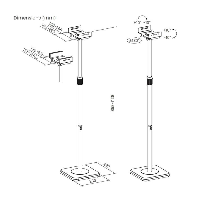 ポールの伸縮範囲は858 - 1128mmまで無段階調整可能、360°回転可能、水平/垂直方向は10°調整可能です。また、ポール内部にスピーカーケーブルを収納可能。スピーカー固定部分はクランプ構造でしっかり固定でき、滑り止めパッドが付属しております。