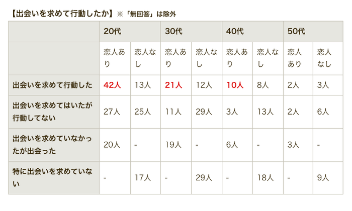 逆に「出会いを求めてはいたが行動してない」については、20代を除くすべての年代で“恋人がいない人”のほうが多い結果です。またその差はどの年代も3倍近くなっています。