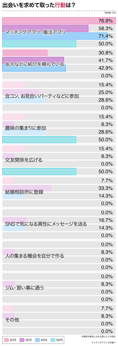 出会いを求めて取った行動では、すべての年代で「マッチングアプリ」が最多でした。特に20代では76.9%の人がマッチングアプリを利用しています。
