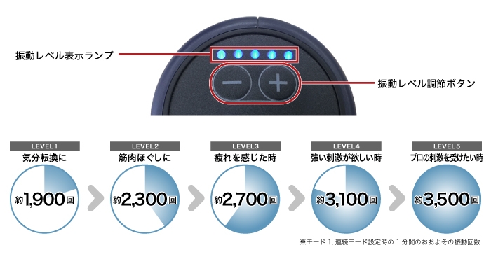 振動のレベルは5段階。LEVEL5の場合、1分間に約3,500回の振動で気になる部位を刺激します。