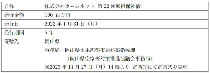 テクノロジーで気軽な住み替えをサポートする株式会社 property technologies(以下「当社」)のグループ会社である株式会社ホームネットは、株式会社中国銀行(以下「中国銀行」)を引受先とする、SDGs私募債「地域応援型」を発行し、発行手数料の一部を岡山県へ中国銀行と連名にて、岡山県の「空き家問題」の解決に向け寄付し、2023年11月27日(月)に寄贈式を行いました。